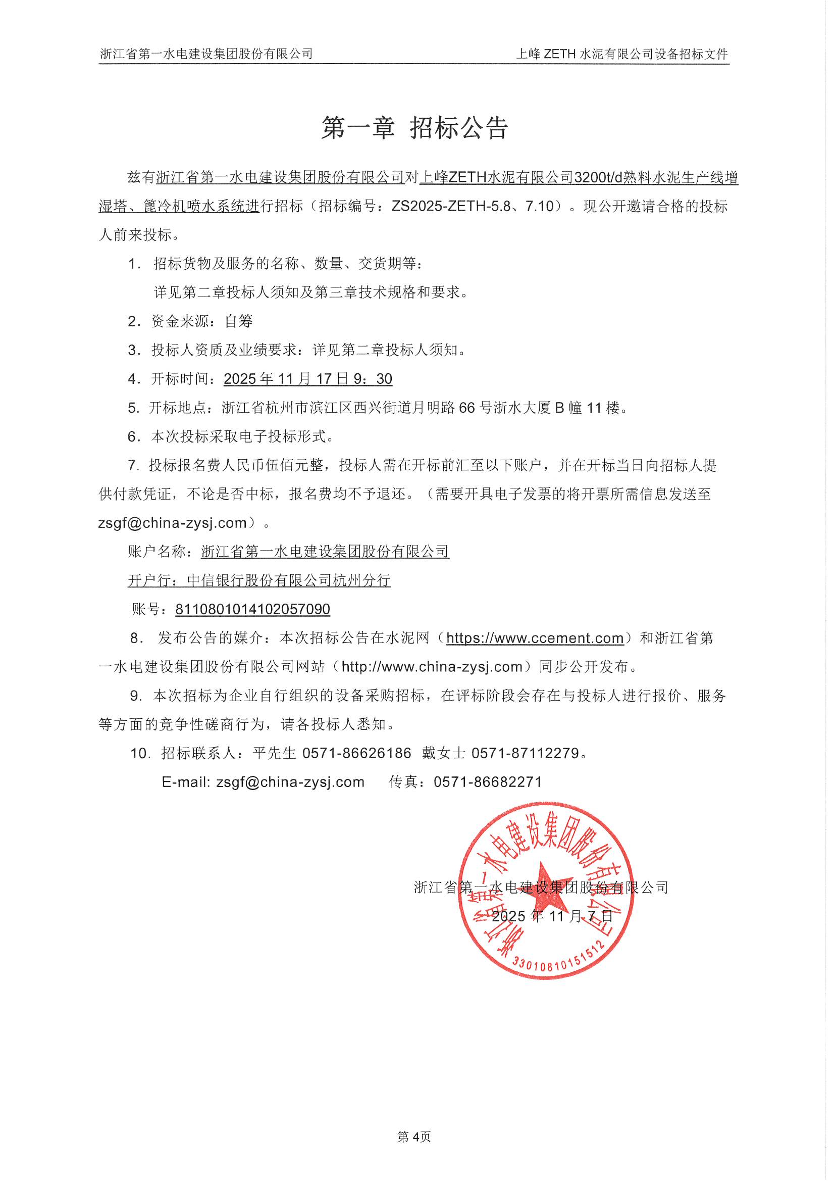上峰ZETH水泥有限公司3200t/d熟料水泥生產(chǎn)線增濕塔、篦冷機噴水系統(tǒng)招標公告